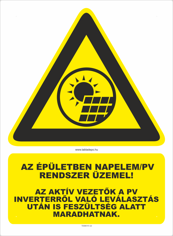 Fehér alapon sárga és fekete nyomtatással felül egyenlő oldalú háromszögben napelem piktogram, alatta AZ ÉPÜLETBEN NAPELEM/PV RENDSZER ÜZEMEL! AZ AKTÍV VEZETŐK A PV INVERTERRŐL VALÓ LEVÁLASZTÁS UTÁN IS FESZÜLTSÉG ALATT MARADHATNAK felirattal. A matricát a telephely bejáratához és/vagy a tűzeseti lekapcsolóhoz kell elhelyezni.