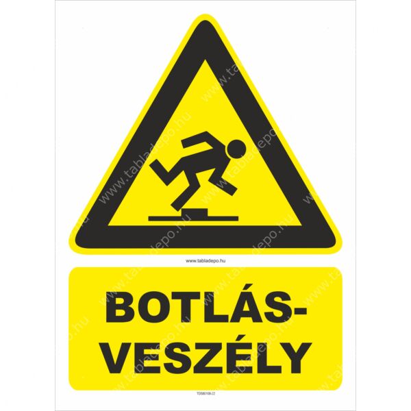Sárga háromszögben fekete elbotló emberi alak, körben fekete szegéllyel, alatta BOTLÁSVESZÉLY kiegészítő felirattal.