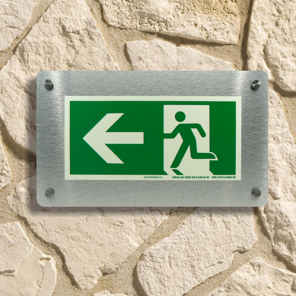 A sarkain lekerekített, szálcsiszolt alumínium felületű szendvicslemez tábla alapra kerül rá a szabványos menekülési irányt mutató utánvilágító jelzés. A táblát négy darab elegáns megjelenésű fém távtartó segítségével lehet a falra szerelni, melyek 20 mm-re tartják el a táblát a faltól.
