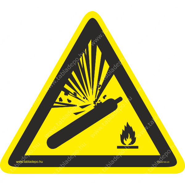 Sárga színű háromszög alapon fekete színű körbe futó sáv, benne felrobbanó gázpalack ábrával.