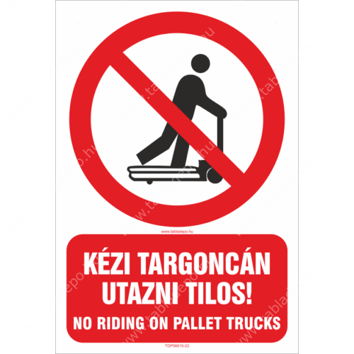 Kézi targoncán utazni tilos - No riding on pallet trucks kétnyelvű tábla