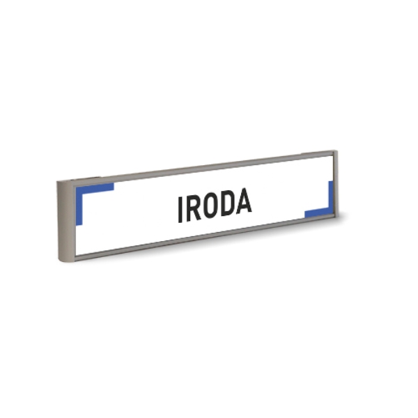 Alumínium profil névtábla tartó iroda feliratú, két átellenes sarkán kék dekorációval nyomtatott papír betéttel és átlátszó védőfóliával.