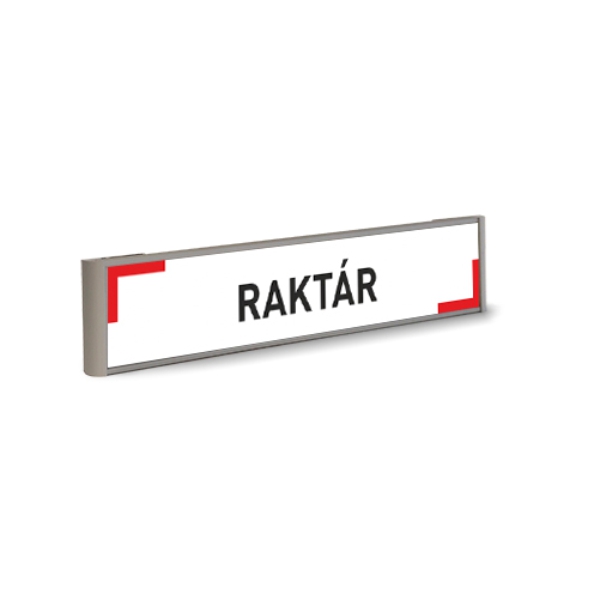 Alumínium profil névtábla tartó raktár feliratú, két átellenes sarkán piros dekorációval nyomtatott papír betéttel és átlátszó védőfóliával.