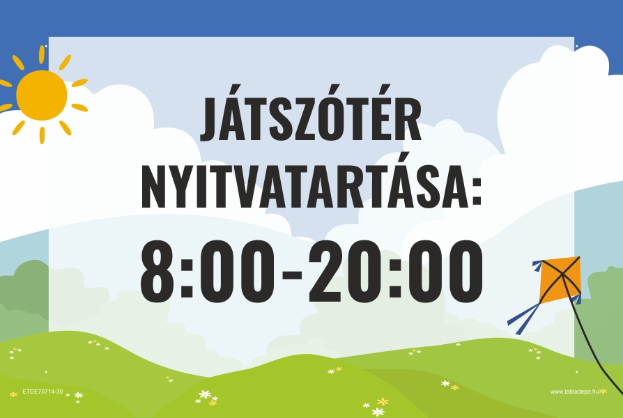 Játszótér nyitvatartás tábla egyedi nyitvatartási idővel. A nyitvatartási idő minden táblára egyedileg kerül nyomtatásra.