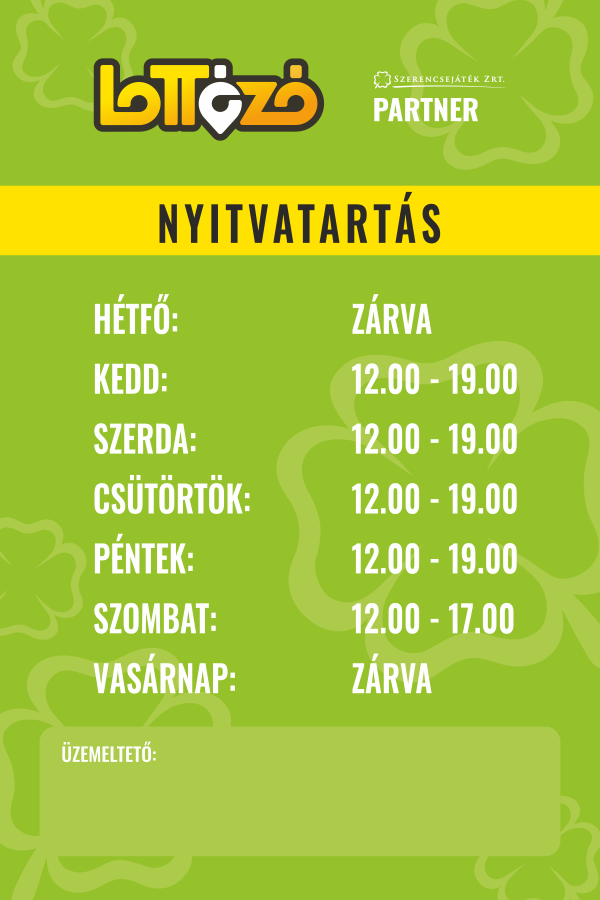 Lottózó nyitvatartás tábla az Ön boltjának adataival