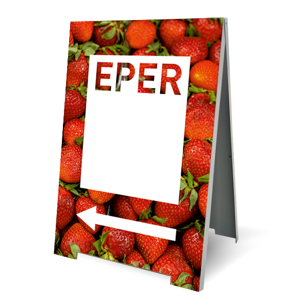 Alumínium szendvicslemez megállító tábla, utcai reklámtábla Eper grafikával. Írható és extra könnyen törölhető felülettel.