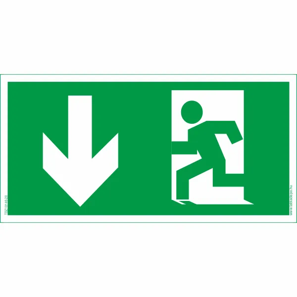 Menekülési útvonalat jelző tábla. Zöld alapon fehér ajtóban balra menekülő ember piktogram, fehér lefele mutató nyíl. A menekülési útvonal az ajtón keresztül lefelé haladva érhető el.