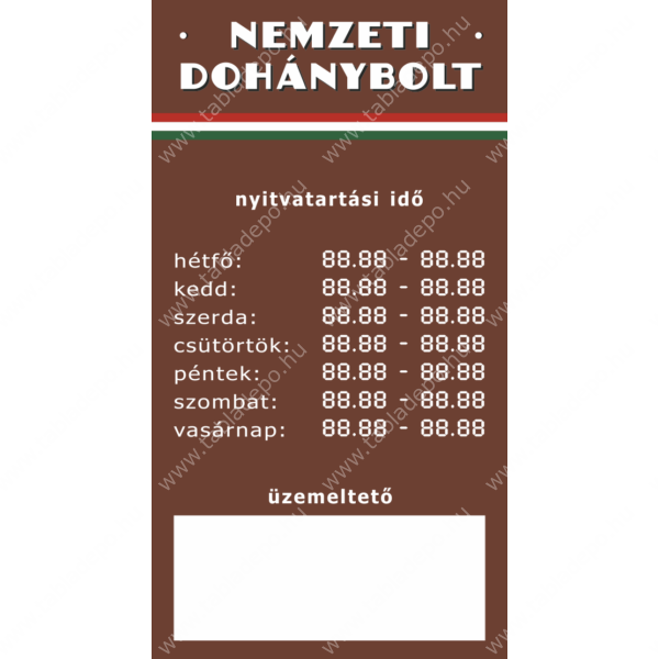 Nemzeti Dohánybolt felirattal, nemzeti színű sávval, napi bontásban felírható nyitvatartási idővel, valamint egyedileg nyomtatott dohánybolt üzemeltetői adatokkal készülő matrica. A termék ára a grafikai szerkesztési díjat tartalmazza.