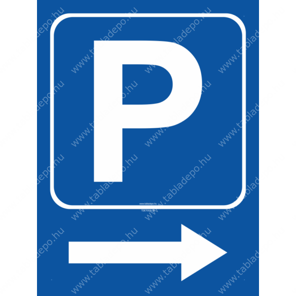 - Kék alapon fehér vékony kerettel, jól látható P betű jelzéssel, jobbra mutató nyíllal.