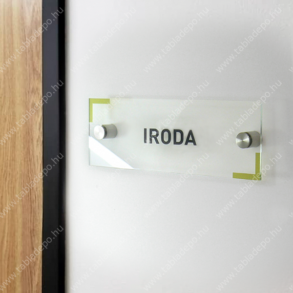 A termék ára egy darab IRODA feliratú, furatokkal ellátott plexi névtáblát és a rögzítéshez szükséges két darab fém távtartót tartalmazza.