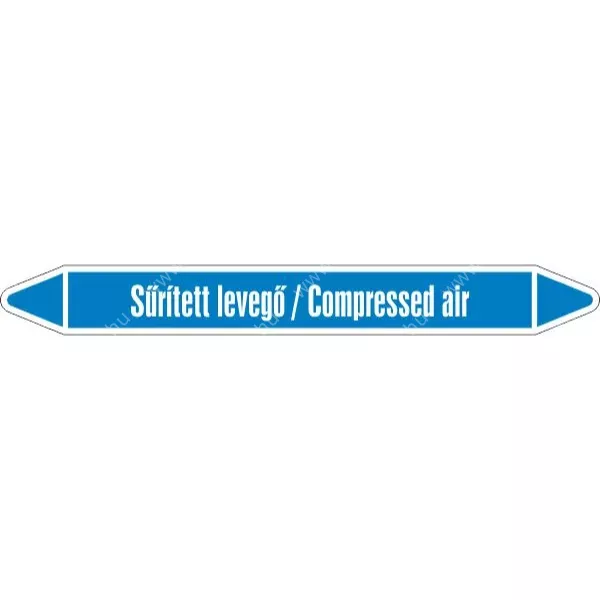 The pipe marker is produced with a blue background, white border, and bilingual Hungarian-English text: Sűrített levegő / Compressed air. The blue background colour indicates that air flows through the pipeline, while the Hungarian and English inscriptions provide clarity for both domestic and international workers regarding the nature of the air in the pipeline.