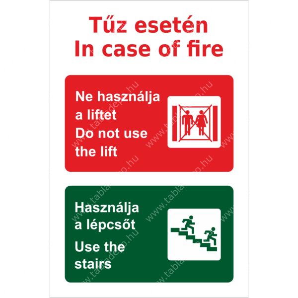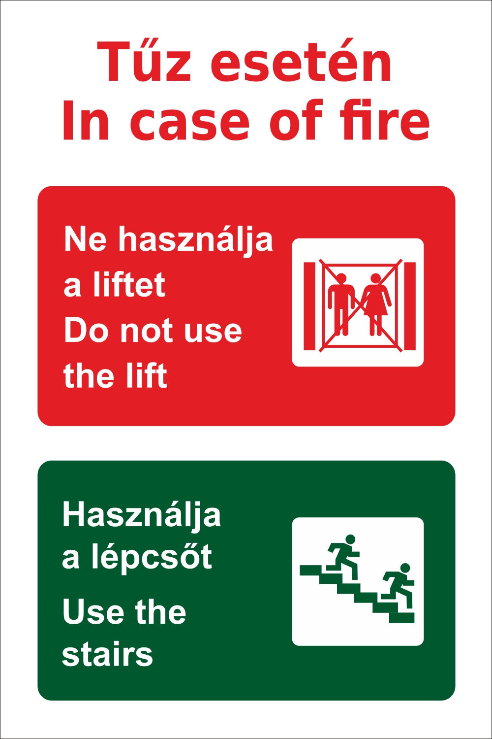 - Tűz esetén - In case of fire; Ne használja a liftet - Do not use the lift; Használja a lépcsőt - Use the stairs feliratokkal.